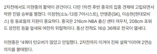 韩国媒体也提到需要警惕的两位球员,一位是身高2.16米的中锋周琦,另一位是身高2.07米的锋线张镇麟,这两人对韩国队依旧具有很强的威胁。(这篇文章没有提到赵睿,可能是没有确定赵睿是否复出,也没有提到胡金秋,因为胡金秋首战表现低迷吧)