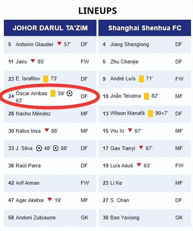 不过这个黄牌数据有出入!比如德转那边的统计,阿里巴本人仅2黄在身,疑点就在柔佛新山对阵上海申花这场比赛中,第59分钟有黄牌未明确显示是给了他。但官方比赛记录中黄牌是发给了他的(下图)。是乌龙,还是黄牌数据无误,这点需要得到亚足联那边的确认。